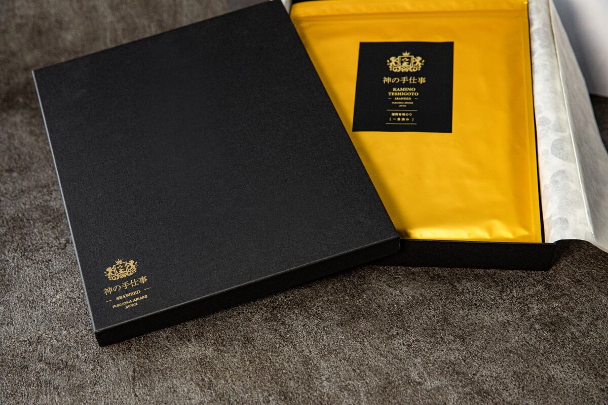 福岡有明のり 最高級一番摘み「神の手仕事」の専用ギフト箱入りです。
