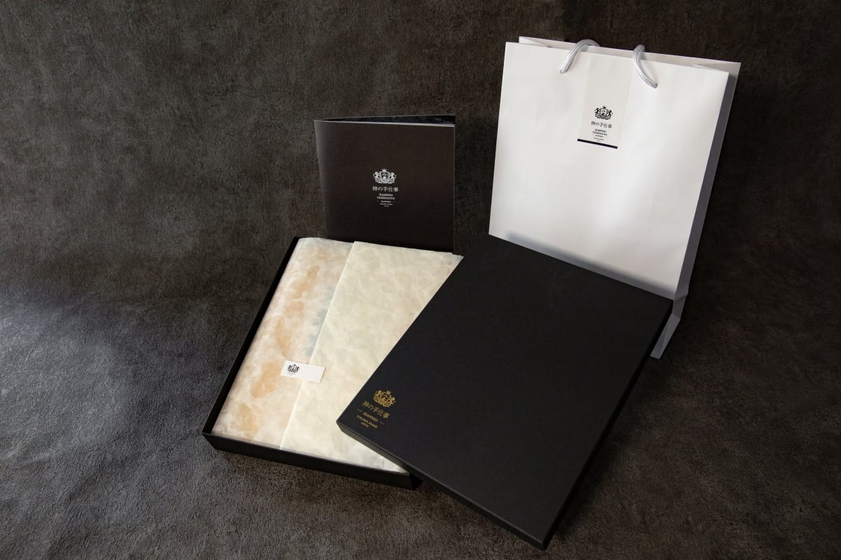 神の手仕事は、雲柄の手すきの和紙でお包みした上で、箱にお入れいたします。
